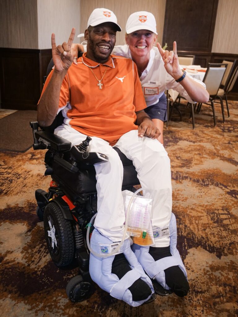As I began to adjust to this new normal, monthly and medical bills began to pile up and I didn’t know where to turn, no income and with limited to no mobility I was concerned that my situation could finally consume me. Then, via social media, I received contact from TLSN (Texas Legacy Support Network), which was one of the original outlets that ran my story back in 1998, seeking any new updates. I conveyed my situation to the Members of the Board, and without hesitation, they elected to help as if an Angel had been sent in their midst. Members of the Board then further explained that TLSN had a non-profit program designed to help former letter winners who needed temporary financial support. With the help of the Board Members of the TLSN family, I was promptly signed up for the program. I was/am so proud that such a program exists within the Longhorn family because it radiates the dedication, care, and support we, as Longhorns, have for each other, especially in the state of life of former athletes.