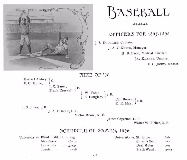 Unfortunately, it rained that Saturday afternoon, and the curveball didn’t curve, so Texas outfielders ran weary miles in a lost cause. According to one witness, the University’s colors were “christened on a dire and stricken field.”