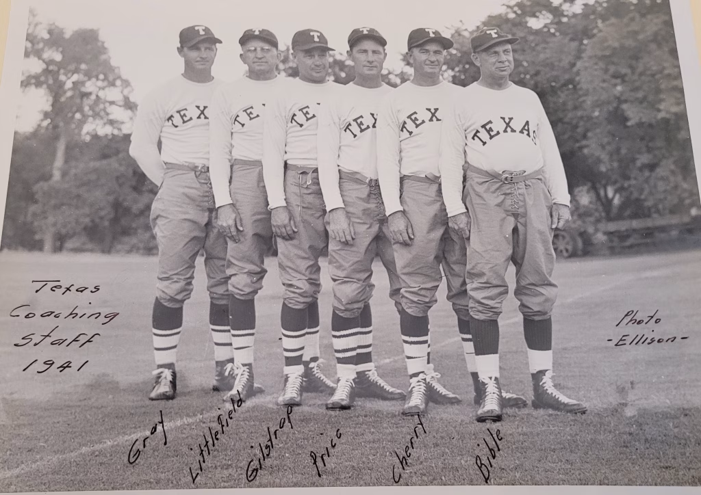 Bible’s record at Texas was 63-31-3 and 35-22-1 in the SWC. His teams won three SWC titles in 1942, 1943, and 1945, more than the combined Texas Coaching staff had won in the first 22 years of the SWC. He built the team’s first lecture and film rooms. He relocated athletes from the musty Oak Grove Dormitory to a modern residence facility called Moore-Hill Hall.