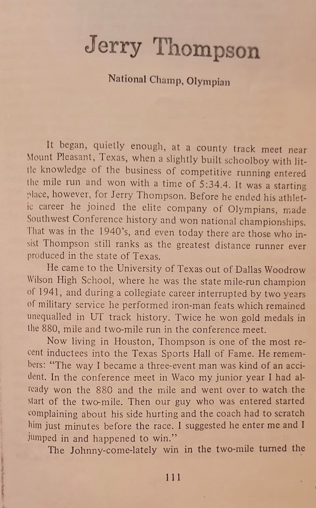 As a special tribute to Jerry Thompsons’ commitment to making Longhorn track a national brand, the Mile run at the Texas relays is now called the “Jerry Thompson mile.”