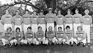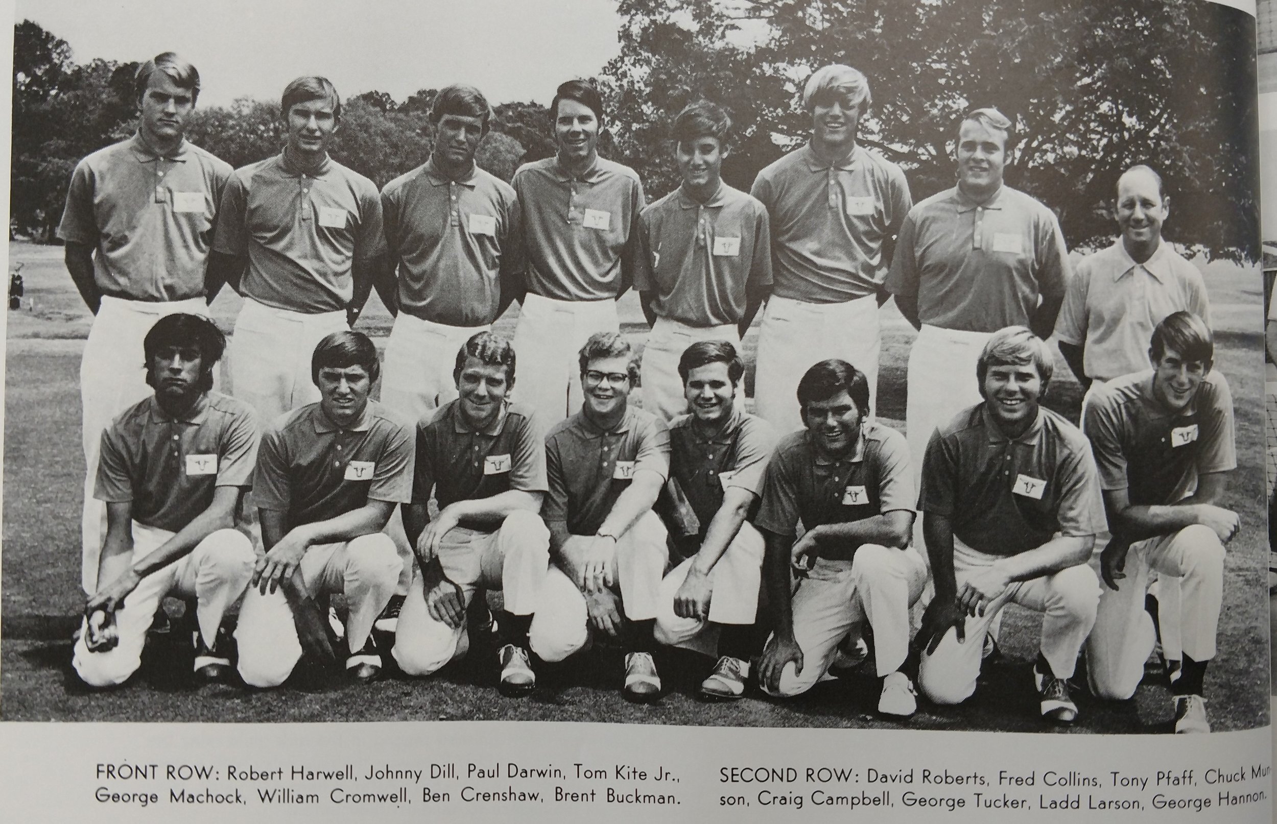 1971 -front row Robert Harwell, Johnny Dill, Paul Darwin, Tom Kite, George Machock, William Cromwell, Ben Crenshaw. Brent Buckman second row: David Roberts, Fred Collins, Tony Pfaff, Chuck Munson, Craig Campbell, , George Tucker, Ladd Larson, Coach Hannon