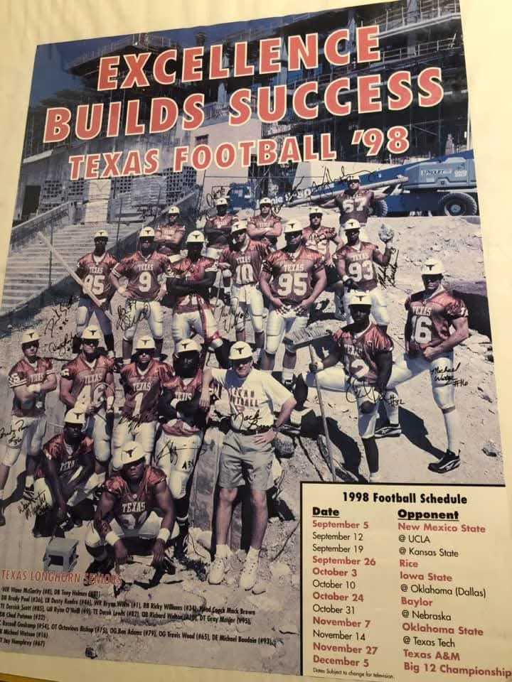 Darrell Royal, Bud McFadin (grandad), and Mack Brown were all waiting for me in Mack Brown’s office on my recruiting trip. Coach Brown orchestrated the entire thing and I will never forget that day. Sitting around and listening to the heritage, friendship, and the competitive spirit that was alive and well in their hearts, made me realize how special it would be to be a part of something so much bigger than myself. Coach Brown brought the history back to Texas and reminded everyone again that, We Are Texas!