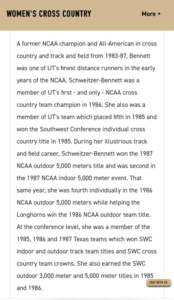 Annie Schweitzer Bennett – 1986 Cross Country national championship team, and Longhorn Hall of Honor Inductee.