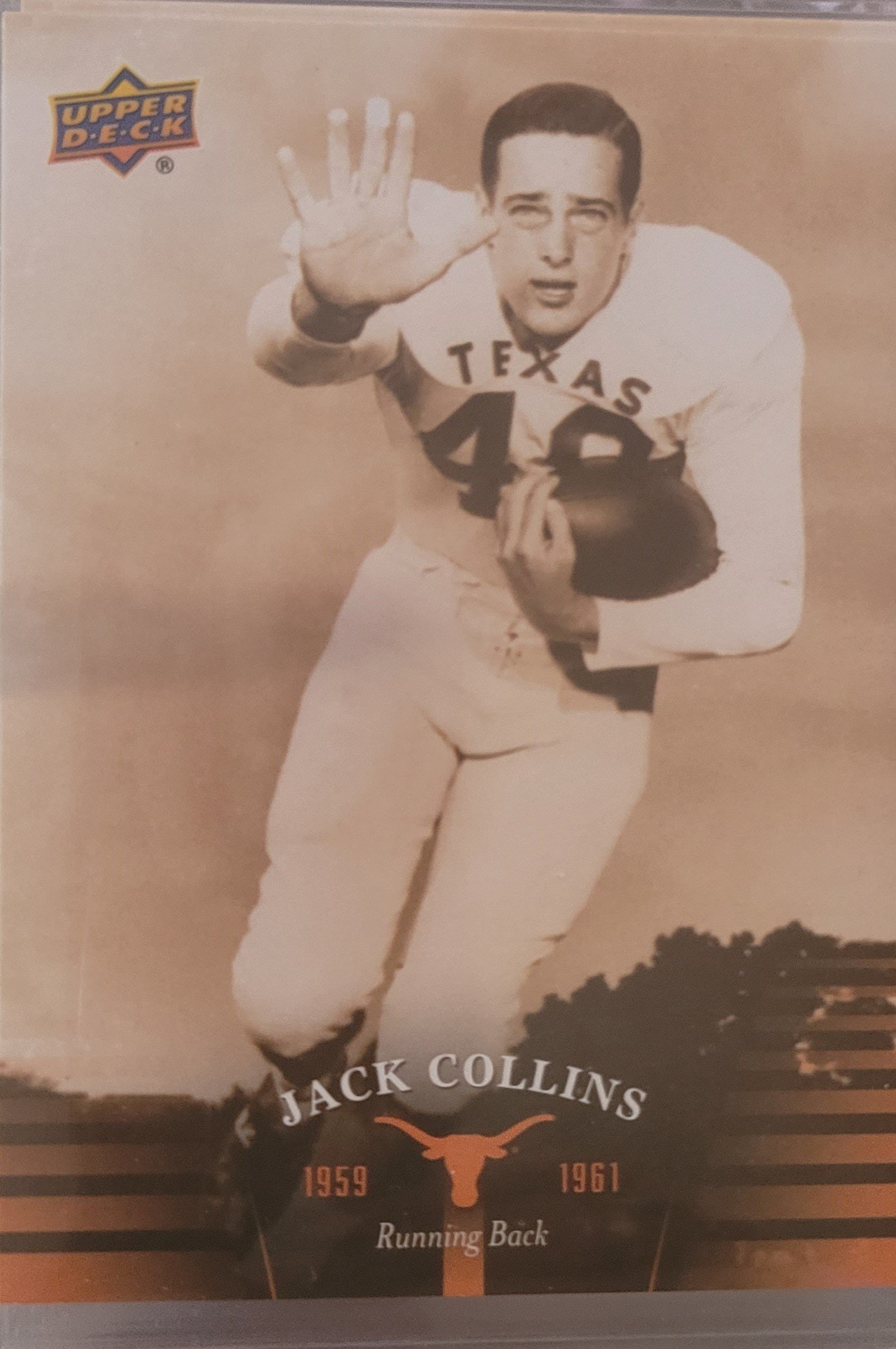 Collins moved on to a standout career at Texas, earning All-Southwest Conference honors as a sophomore in 1959. A member of the Longhorn freshman team in 1958 when freshmen were not eligible for varsity, he was one of the prized recruits in the early years of the Royal era. A versatile player who starred on offense, defense and special teams, Collins helped Texas to a 26-6-1 record and a 16-4 mark in Southwest Conference games in three varsity seasons. The Longhorns won two conference titles and finished the year ranked among the top-four twice from 1959-61, as Collins and his class helped Royal, who came to UT in 1957, build a dynasty in Austin.