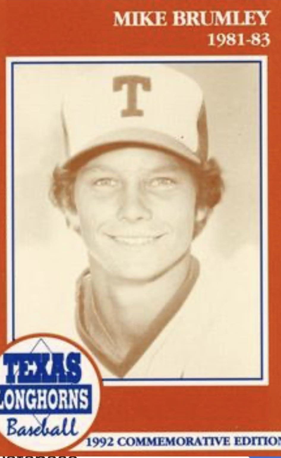 Brumley never made All-American at Texas as did five other Longhorns shortstops, but he hit the key grand slam in a big CWS win over Michigan and was voted to the CWS all-tournament team. He was a part of one of the best UT teams in school history, a slick-fielding infielder for Cliff Gustafson’s second and final national champion. That 1983 team included future major-league stars like Roger Clemens, Calvin Schiraldi and Bruce Ruffin and also included future All-American second baseman Bill Bates.