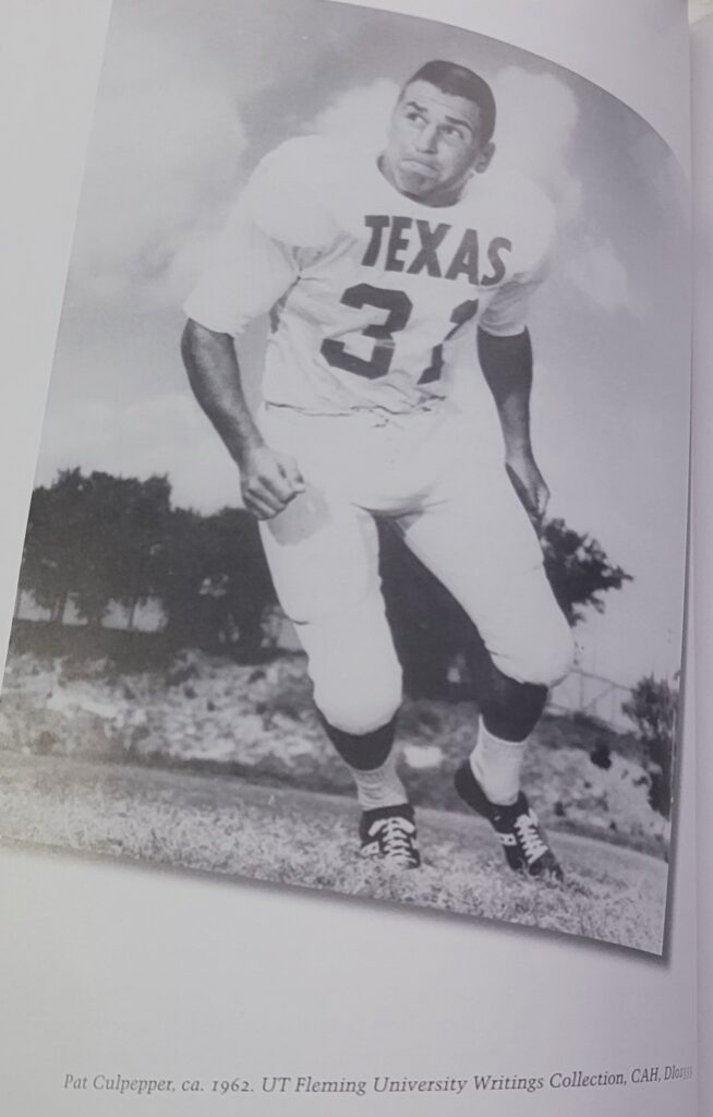 “We (Longhorns) had come through two weeks of full pad practices in the Austin heat and humidity. There were water breaks for the first time due to heat issues in the Southwest Conference. We had five players taken to Breckenridge Hospital with heat dehydration. Only one never made it back – Reggie Grob from Houston. He died along with SMU’s senior captain, Mike Kelsey. Doctors thought the new plastic shoulder pads were causing the heat problems. Most of us wore expensive leather shoulder pads that got wet with our sweat, which let some air through the jerseys, while the plastic pads encased the player and did not allow any air. Before those youngsters died, we never got water breaks, but our head coach, Darrell Royal, like other coaches, learned a tragic lesson. We went to Reggie’s memorial service in Houston as a team on two buses on Monday of our first game.