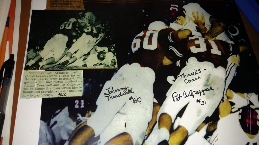 Pat is referring to the deaths of Mike Kelsey, the starting center for SMU, and Reggie Grob from Texas, who had a heat stroke on the same day as Mike but who survived for 17 days before succumbing to liver and kidney failure. Reggie was 19 years old. At the time of Reggie’s passing, only salt tablets were offered to reduce dehydration during practice. According to Jones Ramsey (Sports Information Director), Coach Royal was devastated by Reggie’s death and “collapses and cries” in the enormous arms of Defensive Line Coach Charley Shria. Bill Little said about Reggie,” In a genuine sense, his death meant that thousands and thousands have lived. Out of tragedy, he gave us all a gift. And that’s why he’s a legend”.