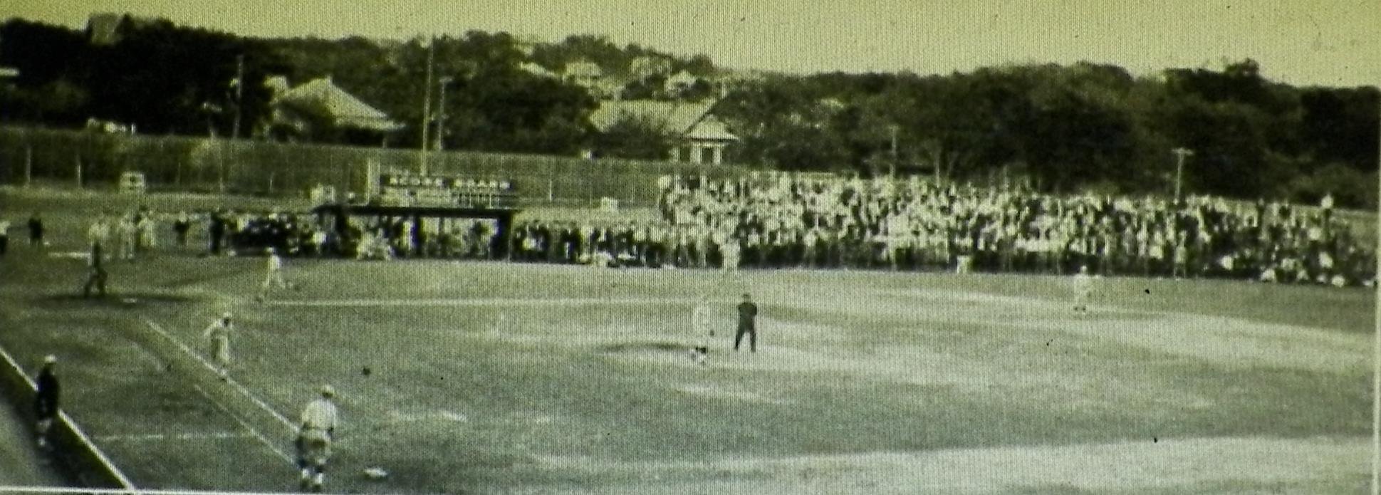 The second and best-known Clark Field and the one that Professor Carlson remembers was part of Longhorn sports history from 1928 to 1975. Clark Field was unusual because there was a 12- to 30-foot (9.1 m) limestone cliff that ran from left-center to center field which made playing the outfield adventurous. The cliff could only be accessed via a goat path in the left-center field. Centerfield was nicknamed “Billy Goat Hill.” There was a scoreboard on top of the hill in the field in front of the fence that could cause even more weird bounces for outfielders. Clearly, this gave the Longhorns a home-field advantage over visiting teams. For example, the Longhorns could easily get an inside-the-park home run when a ball was hit in the direction of the cliff because the opposing outfielders were perplexed by its caroms and how to make plays by using the cliff. Longhorn outfielders could typically hold batters to a double or triple because of their familiarity with the cliff. Half of the team’s outfielders purportedly chose to play on top while the other half chose to play in front of the cliff.[3]