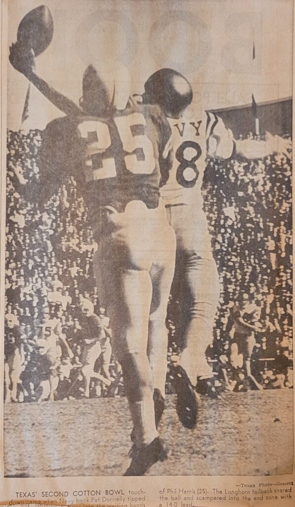 Texas wasted little time in exploiting the Navy signals. We won the toss and elected to receive. On the game’s sixth play, Duke got the signal he was looking for. As the Navy safety ran himself right out of the play, Duke hit 18- year-old sophomore Phil Harris — the youngest player on the field — with a 58-yard touchdown pass. Untouched.