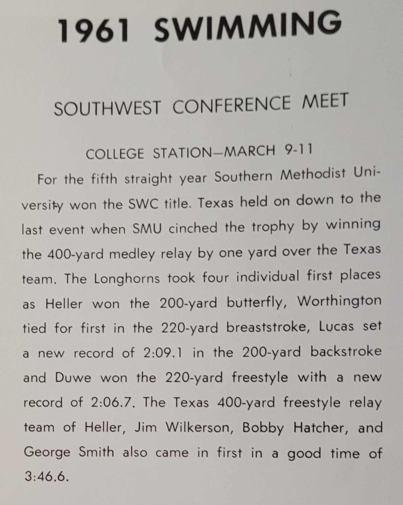 For the 12th year in a row the Longhorns are 2nd to SMU. Captain Dana Curtis sets a new standard in the 500 for the SWC. Gerry Shoemaker was a double winner at the SWC meet and 4 Longhorns participate in the NCAA meet- Curtis, Ligon, DuRapau, and Ravel.