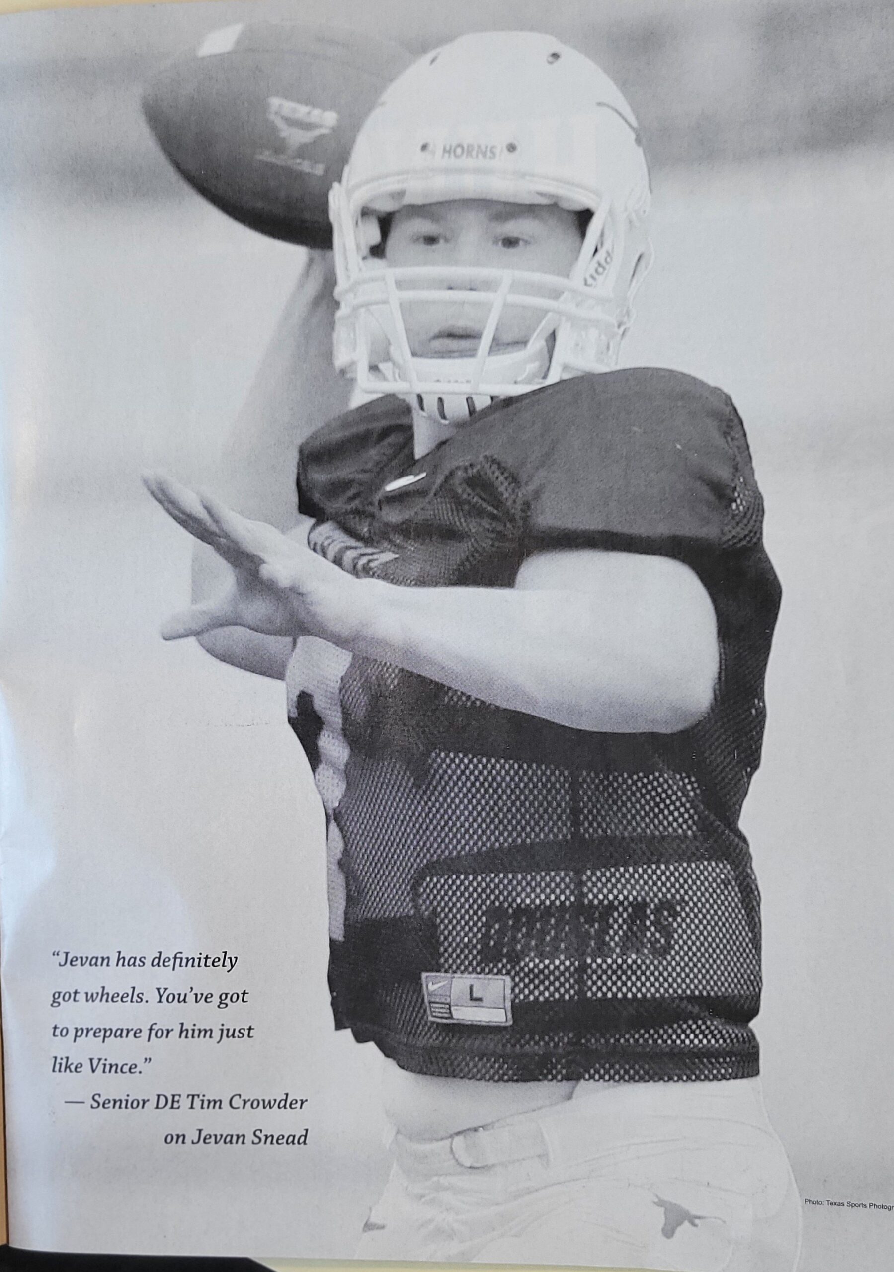 Gifted with a strong arm and speed, Snead went to high school in Stephenville, Texas, and became one of nation’s top recruits. He signed with Texas in 2006 shortly after the Longhorns won the national championship behind quarterback Vince Young.