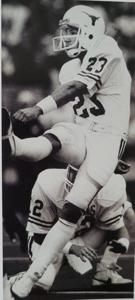 Perhaps the challenges confronting placekickers mirror those of quarterbacks. There’s an increased premium on accuracy. In 1970, Happy Feller, UT’s third-year star placekicker, became the Longhorns’ first specialist named to an All-America team. He had a way with big kicks and had launched successful shots of 55 and 48 yards that turned out to be the difference when Texas beat the UCLA Bruins, 20-17. But Feller, a career .500 field goal kicker, was just five-for-fourteen that senior season, one that brought a second consecutive national title to the Forty Acres.