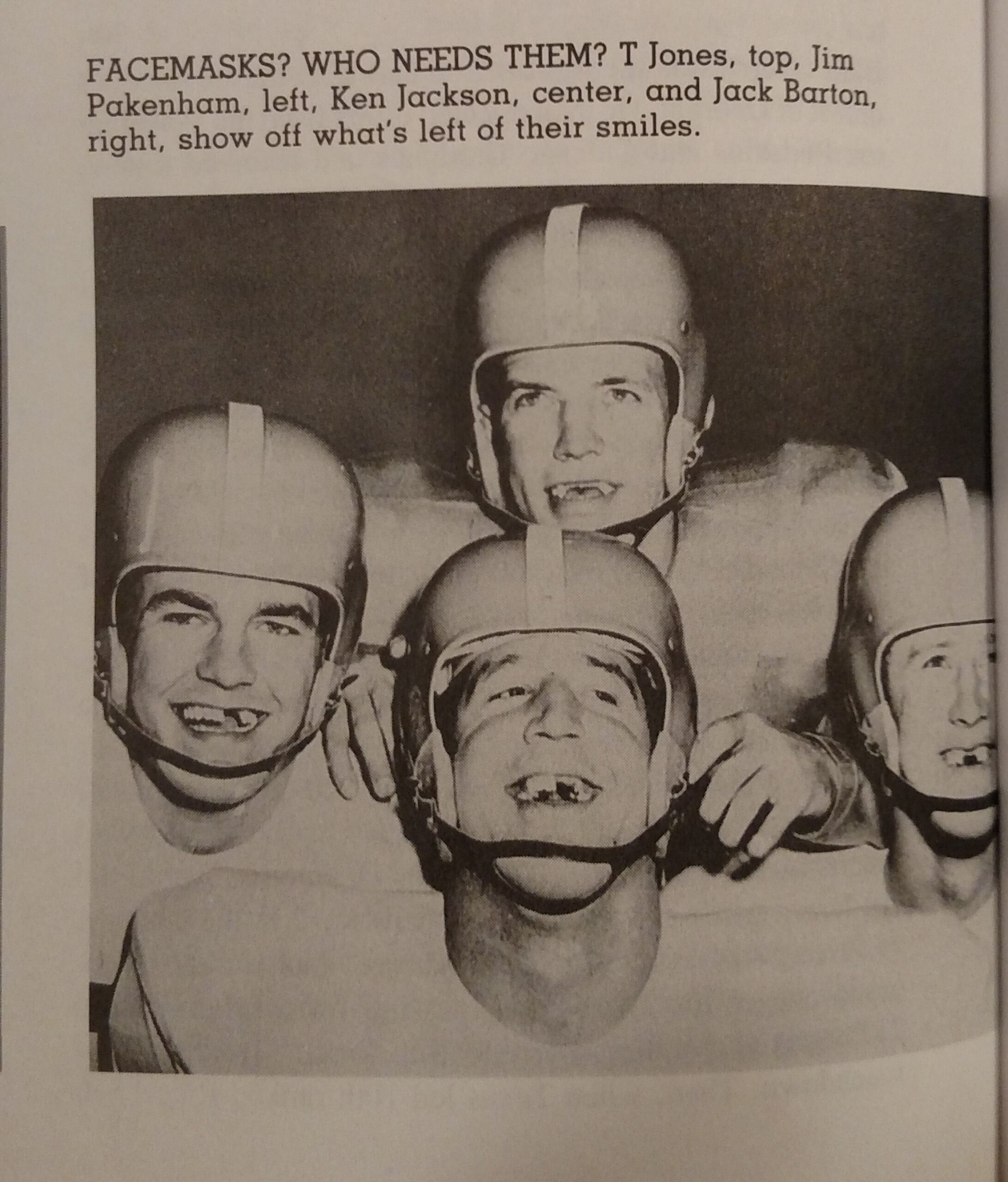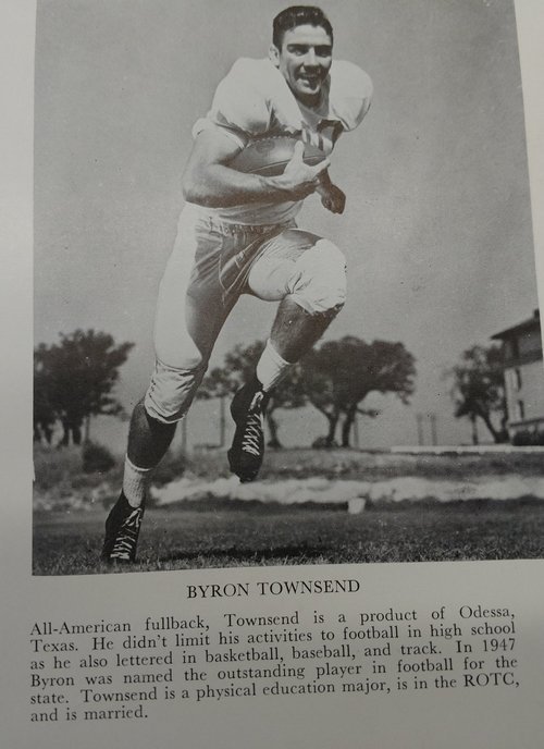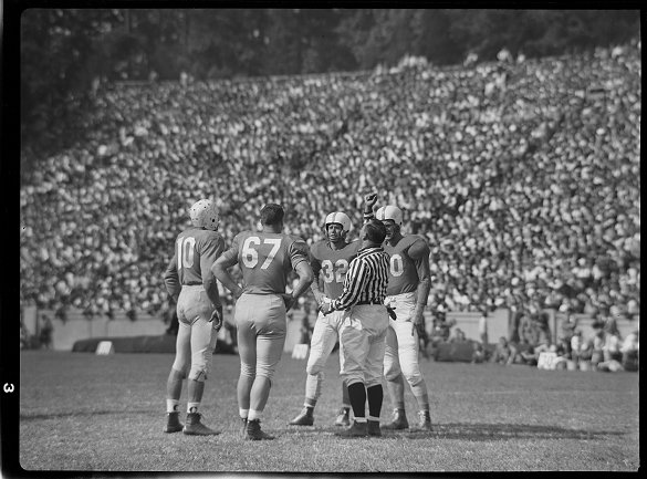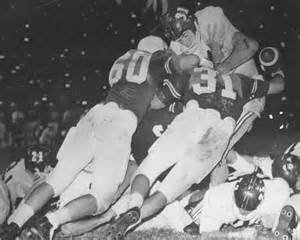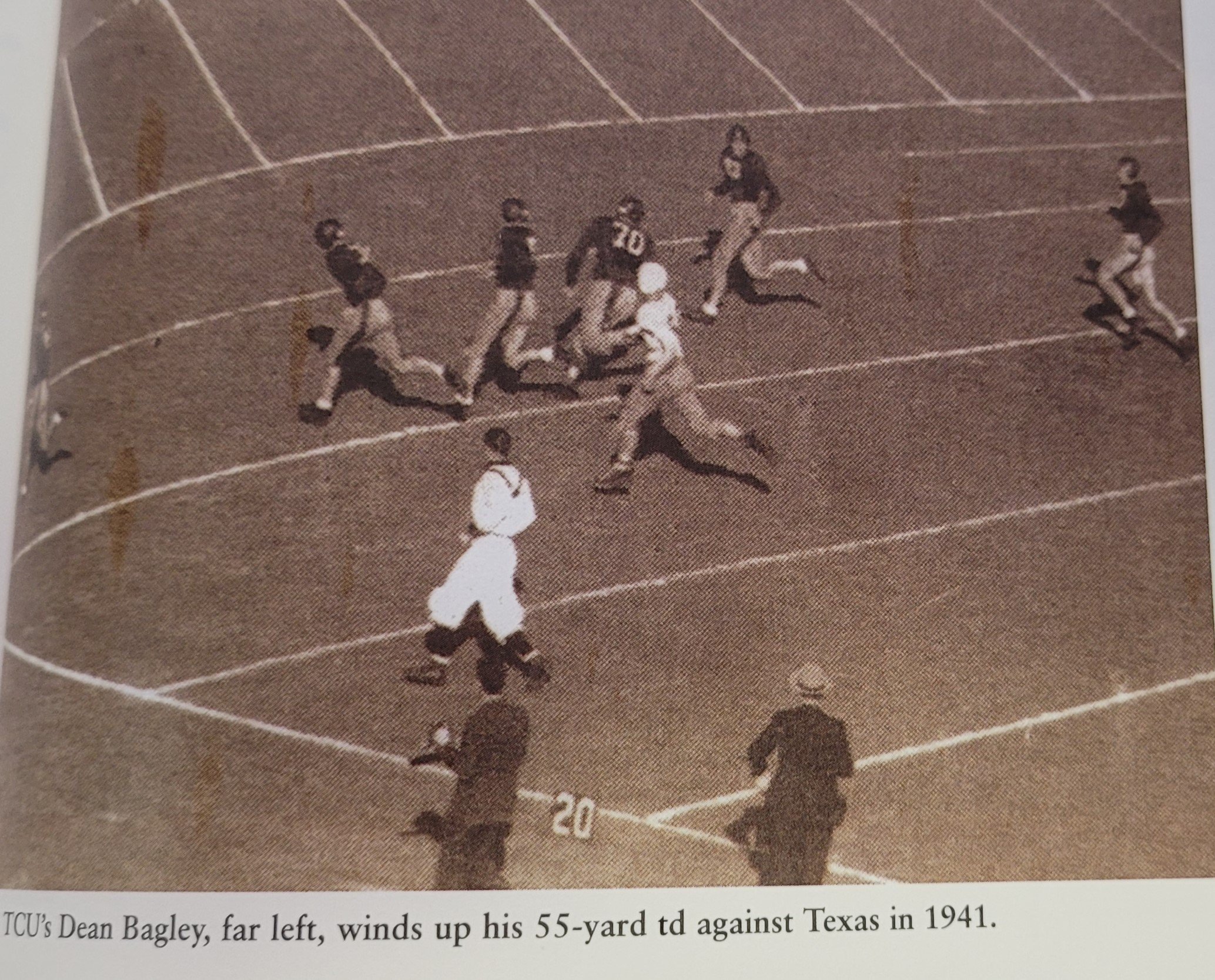 Dean Bagley, far left barely visible in dark uniforms makes the winning touchdown to beat Texas.