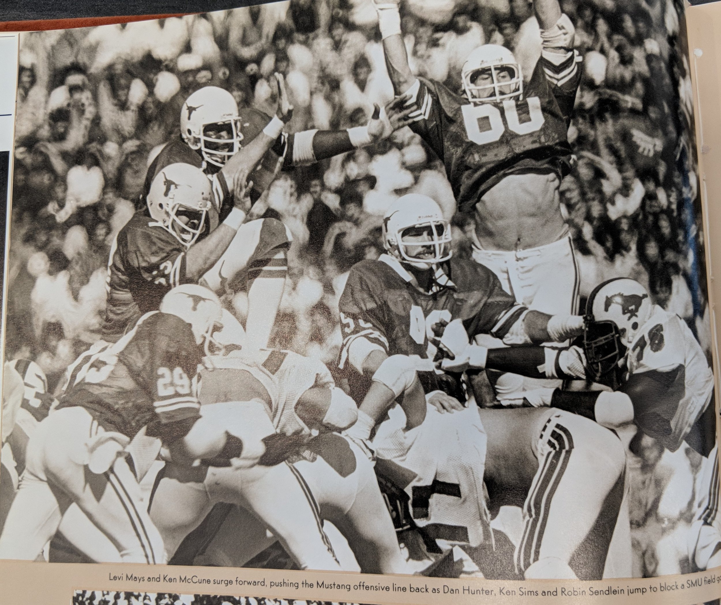 1981 football Levi Mays, Ken McCune, Dan Hunter, Ken Sims, Robin Sendlein blocking on a SMU field goal attempt.