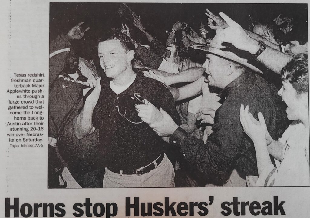 Applewhite, though, was picking up slack via the airways. Bryan White, the speedy but lightly utilized senior, caught two bombs for 113 yards and wideouts Wane McGarity and Kwame Cavil combined for nine catches and another 120 steps. It was McGarity, with scarcely two minutes remaining, who Major found for a short, zipline two-yard TD that was the winner. Applewhite, under duress as he threw, took a rough blow to the head on the play. After the Texas defense, led by linebackers Anthony Hicks and Dusty Renfro, shut the door on NU’s last hopes, senior QB Richard Walton actually took the victory formation snaps. Texas ran out the clock. The home win streak that had endured more than seven years was history.