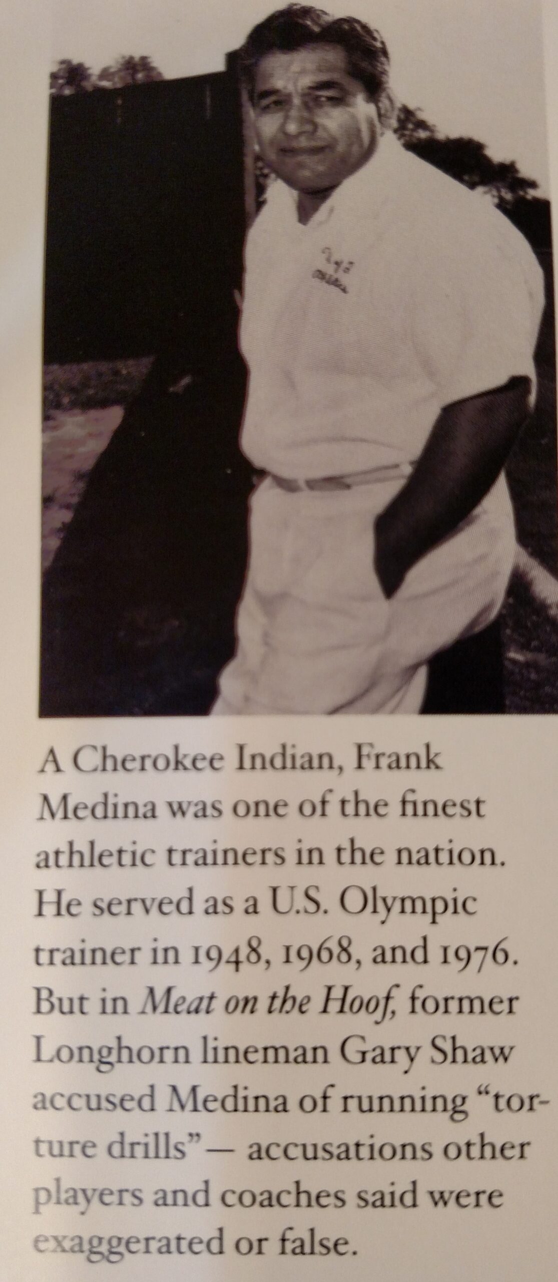 He had lost down to 197 lbs. Loyd told him what Frank had instructed and Coach yelled “FRANK!”…as Frank went scurrying around the corner, no where to be found. From then on Frank took Loyd under his wing to bring him back. He would take him into the back room to tape his ankles where there was air conditioning and give him Mama Medina’s cookies and milk. He even gave me an interview for the school paper for my journalism requirements and gave me a hand-woven peasant purse from the old country. He had a very special place in Loyd’s heart, as I’m sure he did in many a Longhorn player.