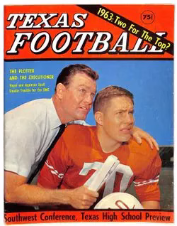 In July ’63 — after bothering the Mr. M’s guys repeatedly — I was rewarded with a cool cover photo of Scott Appleton, in his number 70 jersey, and Coach Darrell Royal in his sideline uniform of the era, a white shirt and tie. Together, they stared intently into the unseen distance. Like a younger and older John Wayne, ready for the outlaws. Turned out, they were seeing UT’s first national championship trophy, fewer than six months on the horizon.