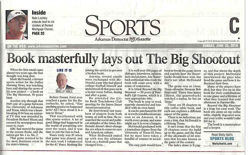 Renowned sports writer Mark McDonald wrote the definitive book on Texas -Arkansas 1969 Big Shoot-out. His storyline explores more than the game highlights. In his book, Mark manages to merge game highlights, political upheaval, racial tensions, and the Vietnam protest into a cacophony of America in 1969.