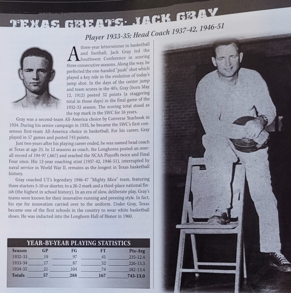 End of 1934-35 season: Jack Gray earns consensus first-team All-America honors. Gray becomes not only the first Longhorn (and one of only three UT players in school history) but also the first player in Southwest Conference history to garner first-team All-America accolades. Gray led the SWC in scoring three consecutive years