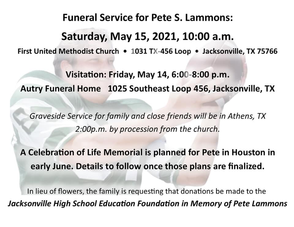In lieu of flowers, the family requests that donations be made in memory of Pete Lammons to the Jacksonville Education Foundation online at http://jisdfoundation.org/donate or mailed to JEF (Jacksonville Education Foundation), PO Box 631, Jacksonville, Texas 75766 (please notate donation in memory of Pete Lammons).