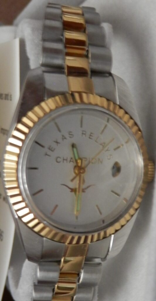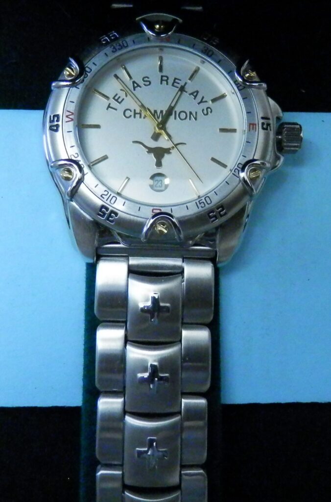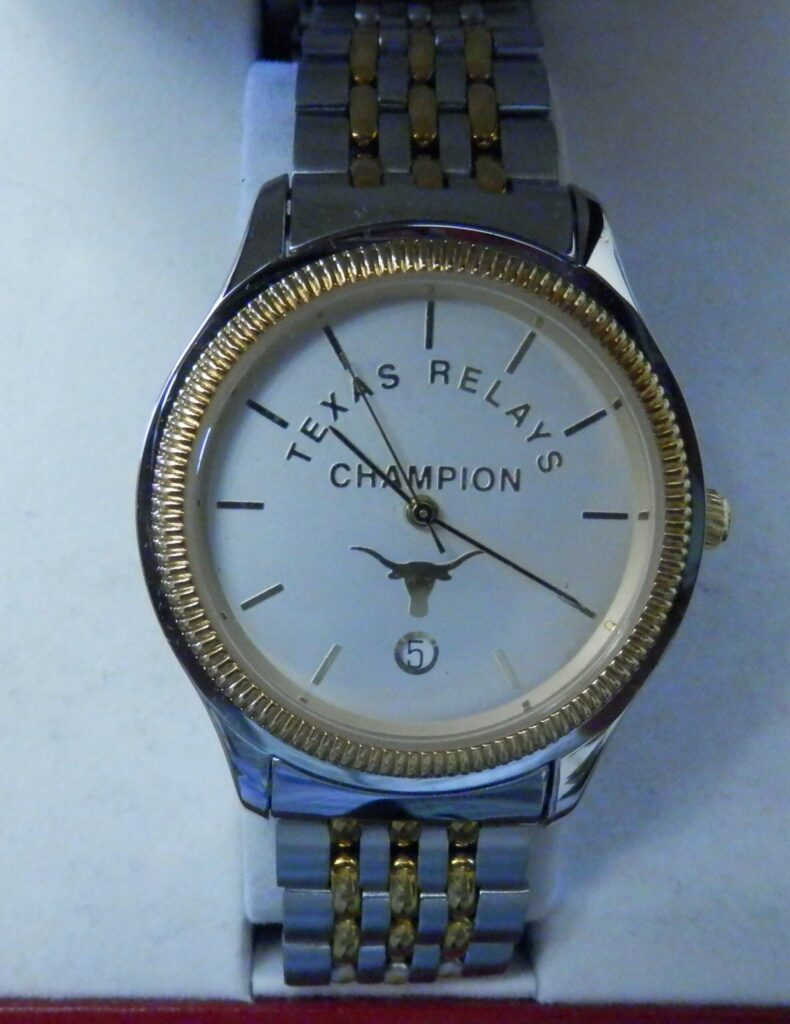 Rey Moreno says,“First place winners received a Texas Relays watch during Cleburne Price coaching period ( sorry no picture). In 1975, the watch was a gold digital Texas Instruments watch. Watches were presented @ all major Relays, including Kansas and Drake.