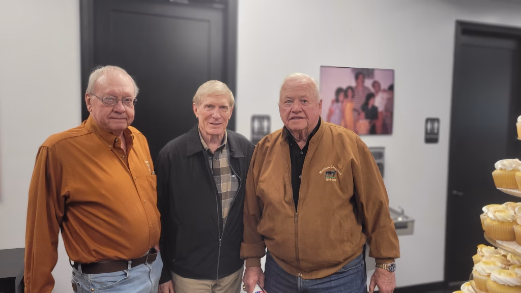 Below are some photos of Jerrel’s Longhorn letterman events at his ranch, many years after our playing days. The first photo: Jerrel is in the top row, far right. Second photo: Mac McKinney, Cotton Speyrer, and Jerrel Bolton. Third photo: Billy Dale, Julius Whittier, Jerrell Bolton, ???, Mike Campbell, and Ted Koy.