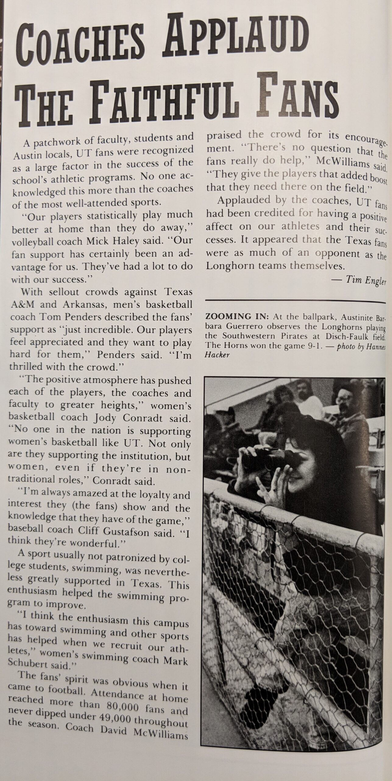 Of course, if all fans were terrible all the time, then hiring coaches would be problematic, but that is not the case. There are also great fans, as witnessed by quotes from Longhorn coaches in 1990. Coach McWilliams praises the Longhorn Fans. As head coach, Coach McWilliams had three losing seasons and resigned one year after winning the SWC championship but remained at U.T. with the Athletic department.