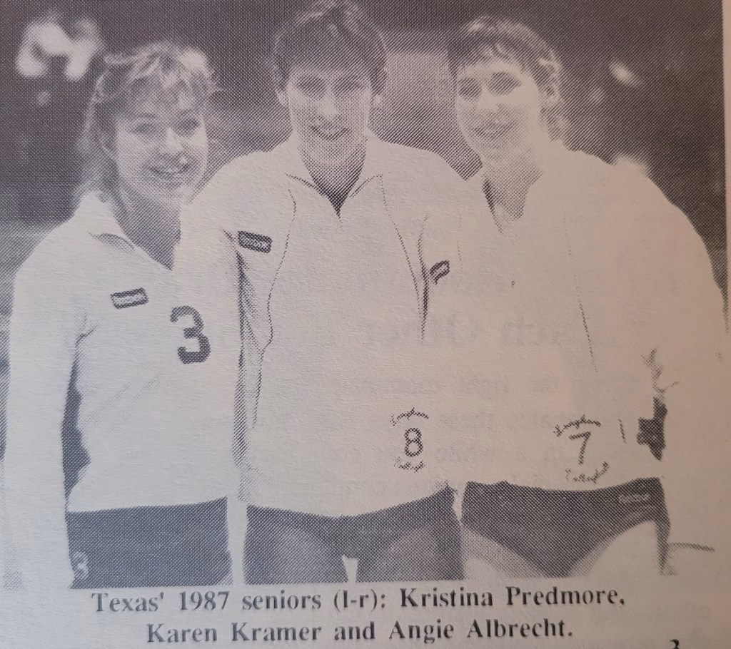Texas won the national championship-winning all 5 matches by 3-0 scores. Volleyball outside of California finally gained some well-deserved respect. 4 of the six starters were from Texas. Texas had three players make the all-tournament national championship team – Dawn Davenport, Sue Schelfout, and Nichols. Katie Salen played her heart out for the team despite a broken nose and hand during the season.
